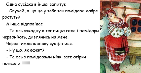 Одна сусідка в іншої запитує – Слухай, а що це у тебе так помідори добре ростуть? А інша відповідає – Та ось заходжу в теплицю гола і …