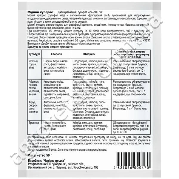 Приготування розчину: Для виготовлення розчиняють в 10 літрах води 300-500 г мідного купоросу. 0,5-1% розчини вважаються лікувально-профілактичними. Вони викор …