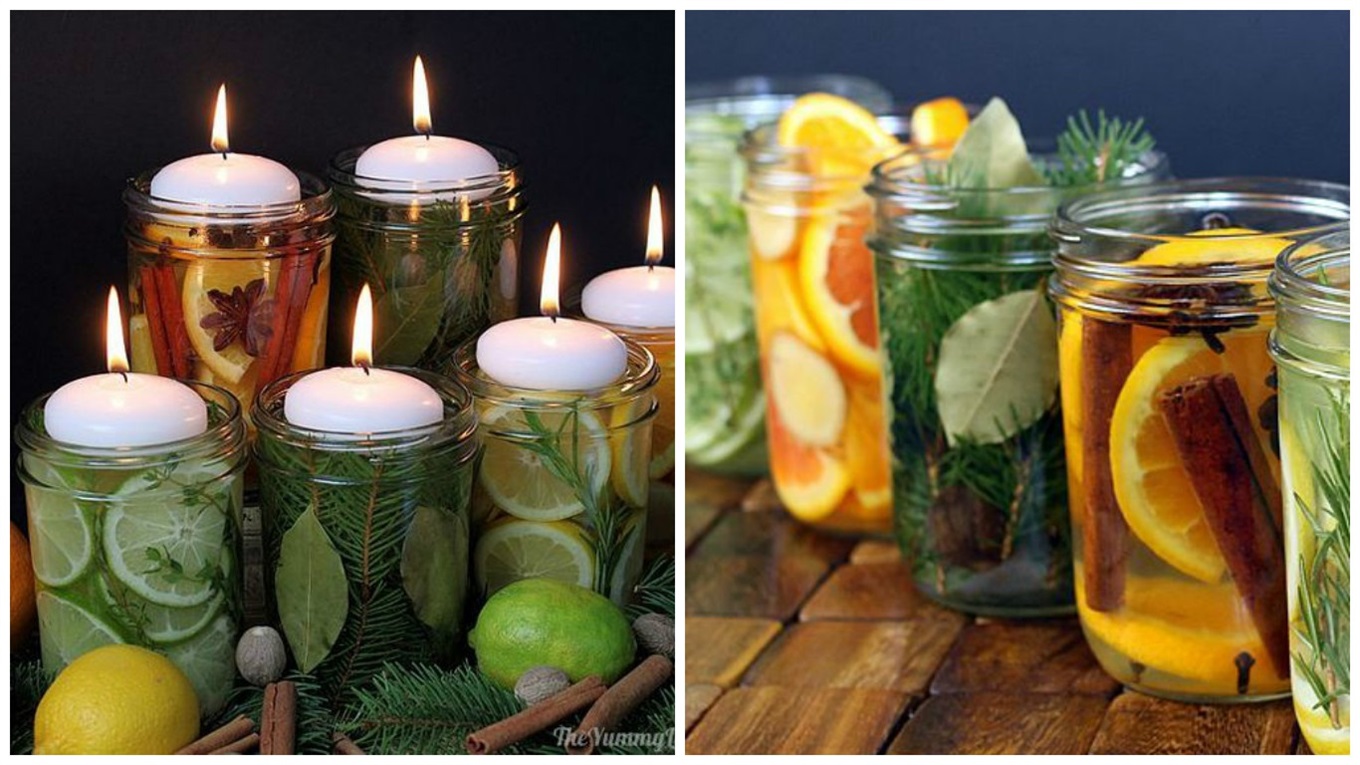 соя або бджолиний віск;; лавровий лист;; палички кориці, гвоздики;; соснові міні-шишки;; сушений розмарин; ; лимон;; лайм;; апельсин;; горілка; …