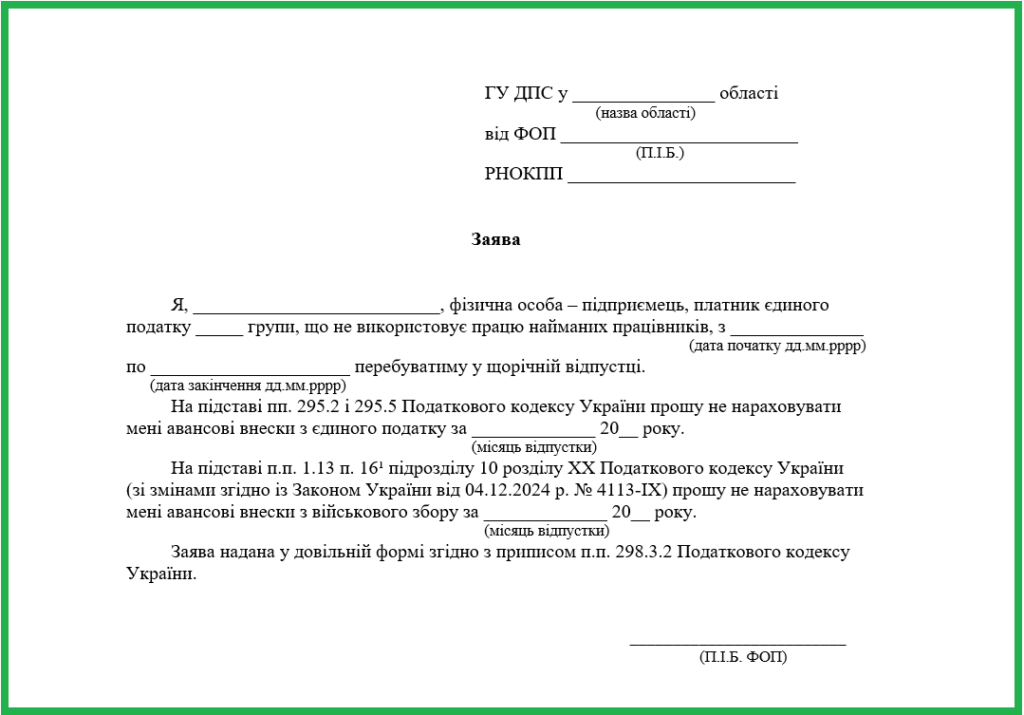 Фактично відпустка для ФОП виглядає як можливість не сплачувати єдиний податок (ЄП) та військовий збір (ВЗ) протягом місяця. Для ФОП такий пері …