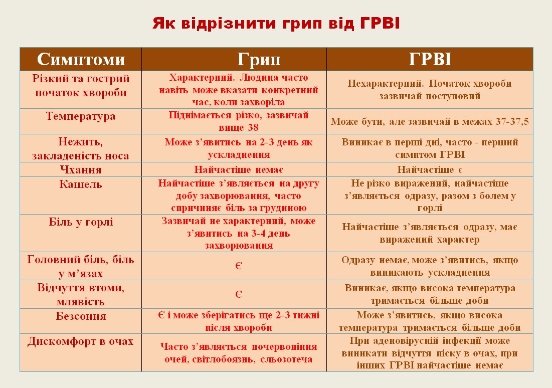 Основна різниця у симптомах грипу і ГРВІ полягає у тому, що грип розпочинається раптово і гостро, а впродовж періоду хвороби різко виражені ломота в тілі, озноб, головний біль і біль у м'язах, а ГРВІ – зазвичай починається поступово і супроводжується відчуттям “розбитості” та загального нездужання.