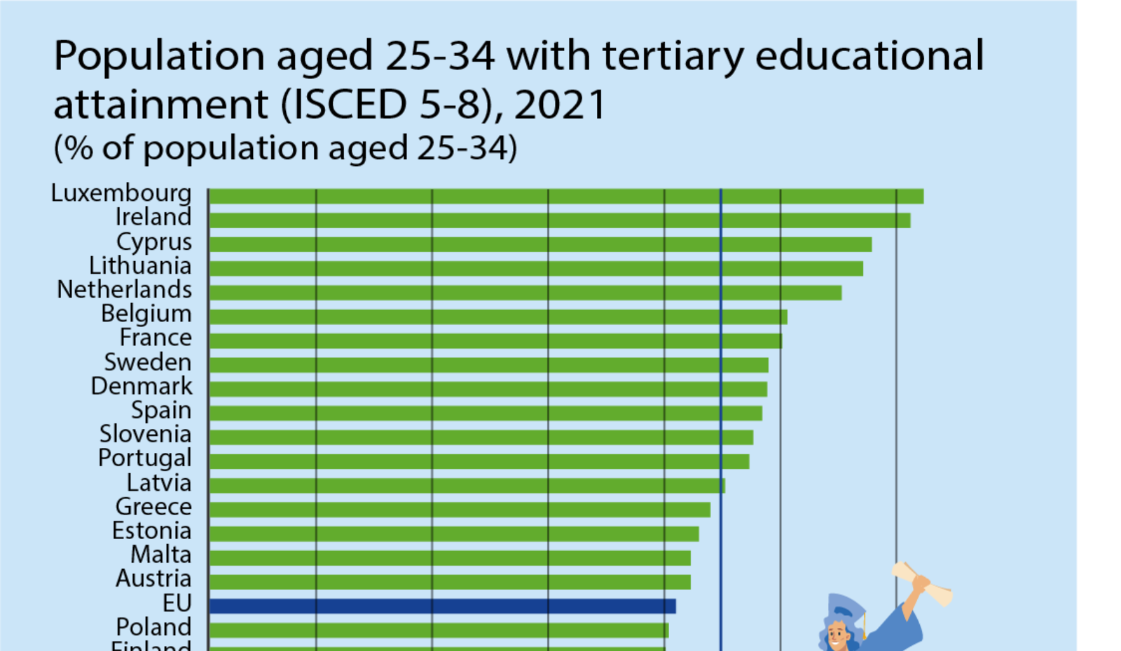 Водночас у 2021 році серед жінок випускників закладів вищої освіти більше (47%), ніж серед чоловіків (36%). Хоча за останні десять років частка чоловіків, які мають вищу освіту повільно зростала, темпи зростання були нижчими, ніж серед жінок. Відтак ґендерний розрив з часом дещо збільшився.27 May 2022